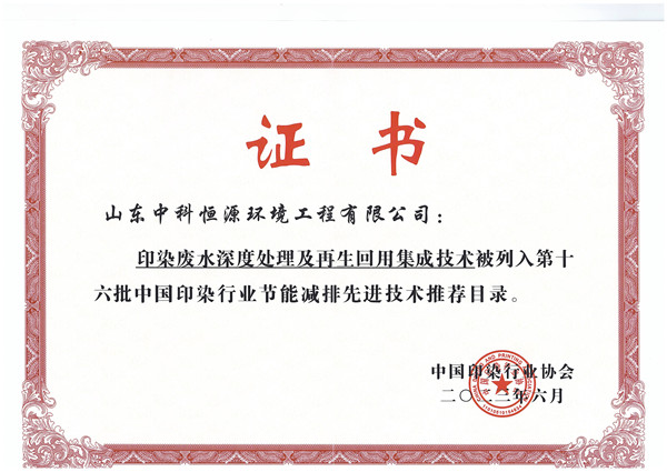 我司印染废水深度处理及再生回用集成技术”被列入《第十六批中国印染行业节能减排先进技术推荐目录》