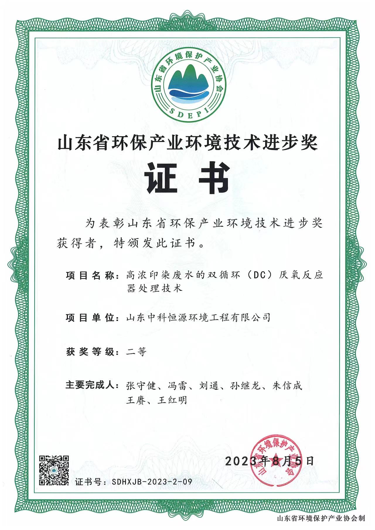 我司荣获“优秀会员单位”、张守健董事长荣膺“优秀企业家”称号,我司自主研发的“高浓印染废水的双循环 (DC) 厌氧反应器处理技术”荣获“山东省环保产业环境技术进步奖二等奖”。